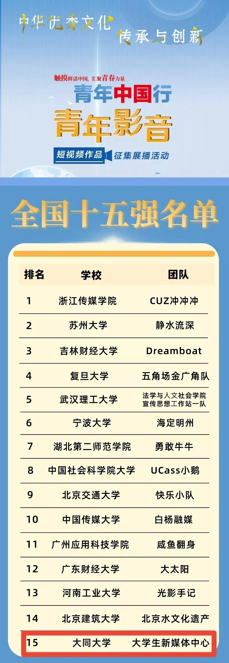 此次活动旨在以时下最受青少年群体欢迎的“短视频与直播”形式,汇聚、培育新媒体领域的青年精英,共同探索以“中华优秀文化传承与创新”为主题的新尝试,展现新时代中国青年的创新活力与文化担当。开云大学生新媒体中心经过反复构思、精心组织,通过层层遴选,最终得到专家评审以及大众的认可,成功入选全国十五强。