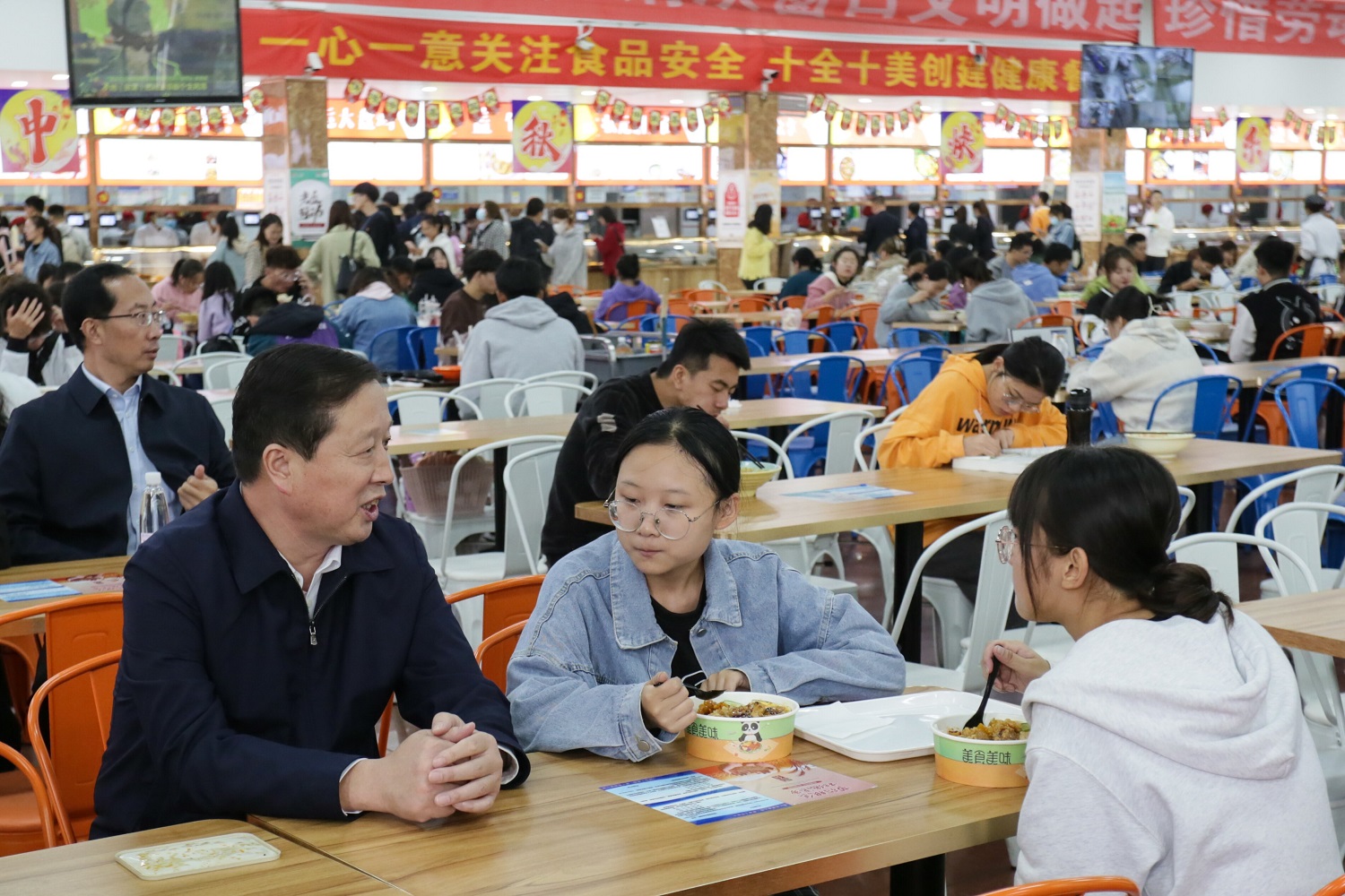 弓永华一行来到学苑餐厅,向餐厅工作人员了解饭菜质量和价钱,并与同学们同坐一桌,热情询问学生对学校的印象。弓永华叮嘱饮食服务中心的负责人,要严控食堂餐食价格,提高饭菜质量,让同学们能够吃到便宜可口的饭菜。