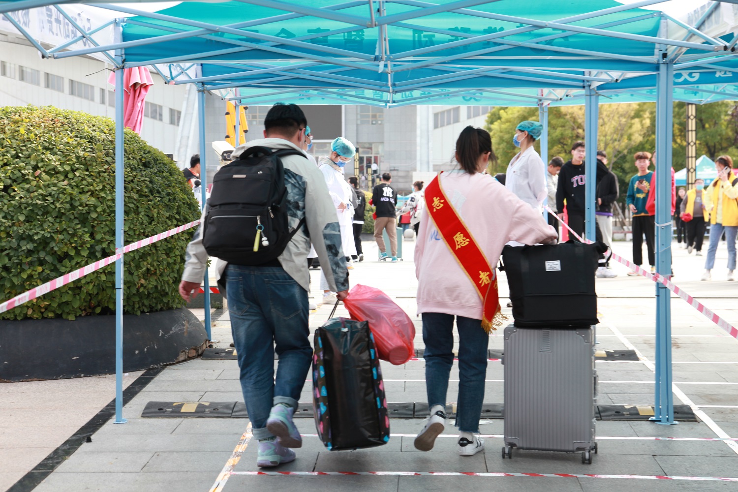在迎新现场,新生们拎着大包小包,从专用通道步行进入。在经过体温检测、健康码、行程码等检查后,陆续进入校园。随后,学生们陆续来到天翔体育场北面统一进行核酸检测。