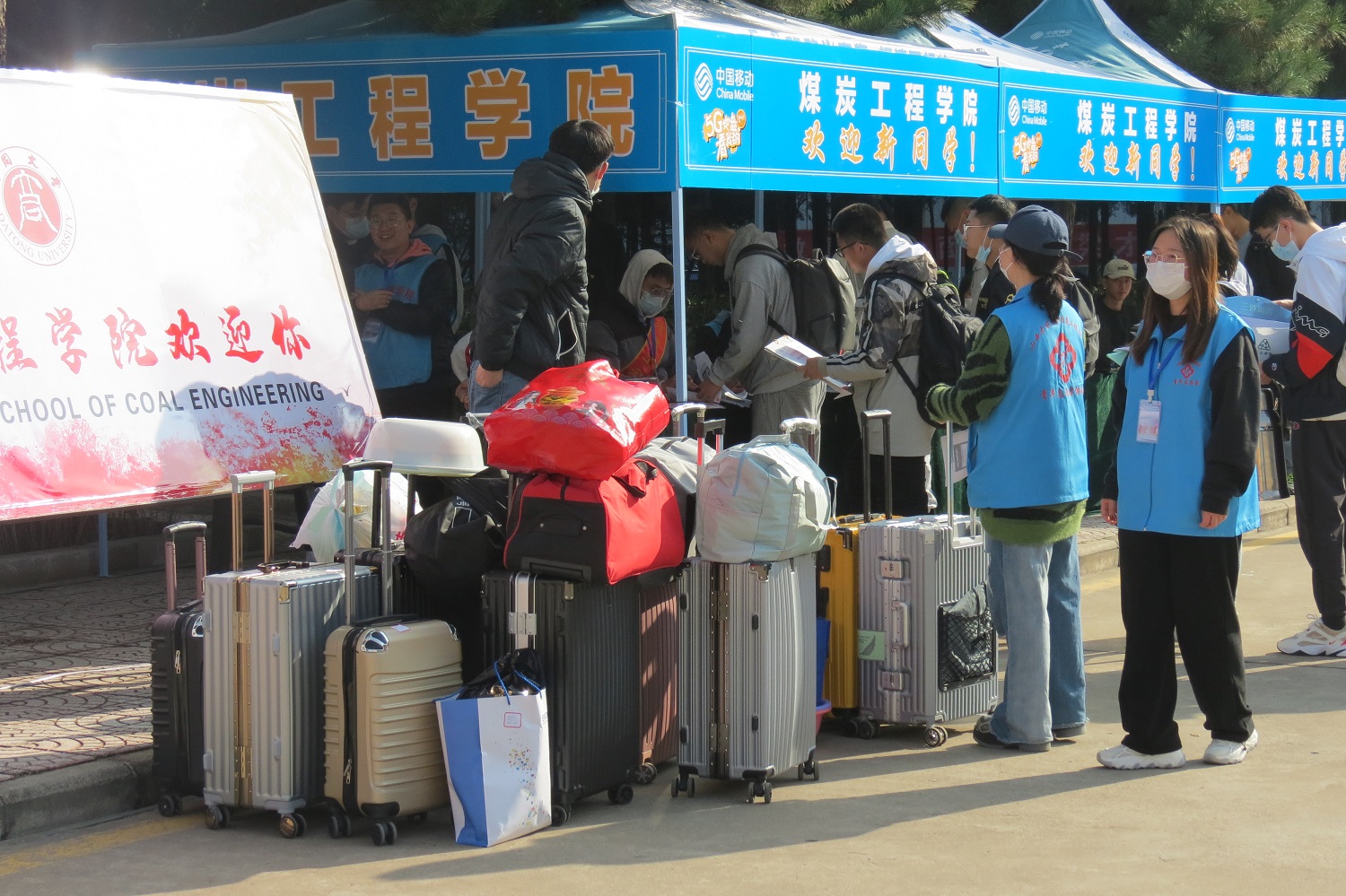 云冈学学院的迎新点远远看去如同一道靓丽的风景线,志愿者们统一的服装,标有“云冈”字样的学院胸牌让云冈学院迎新点在众多迎新点中更加鲜明。