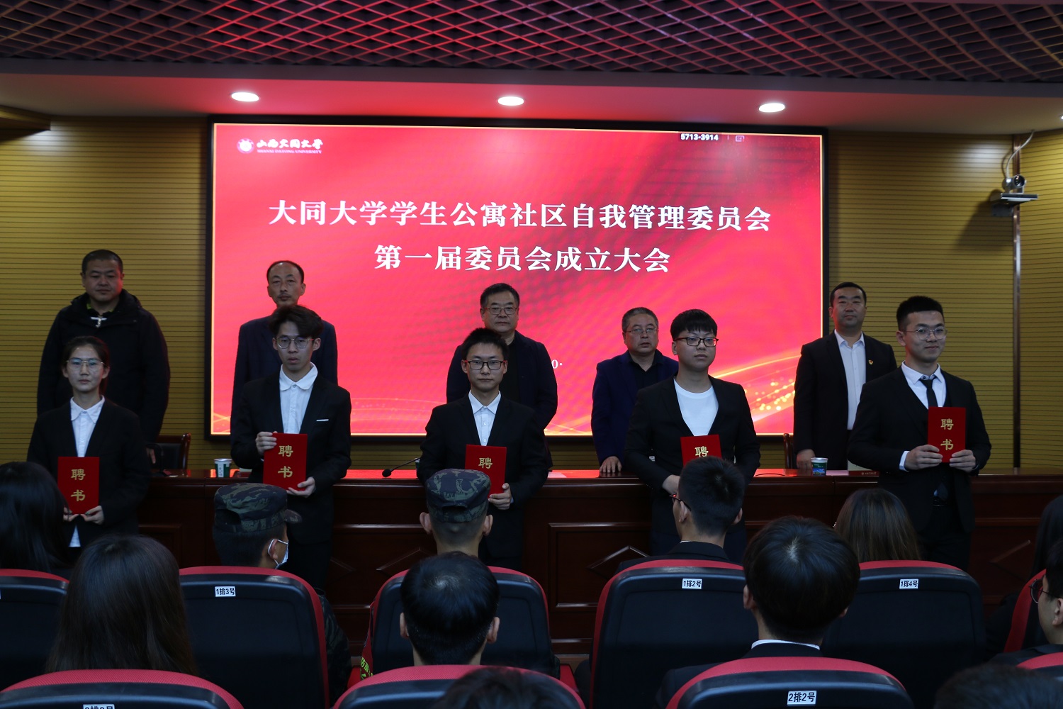 周永军宣布了学生公寓社区自我管理委员会第一届委员会机构设置及成员名单。公寓社区自我管理委员会下设六个部门,分别为办公室、活动部、安全部、信息部、考勤部、宣传部。会上为公寓社区自我管理委员会第一届委员会全体成员颁发聘书。