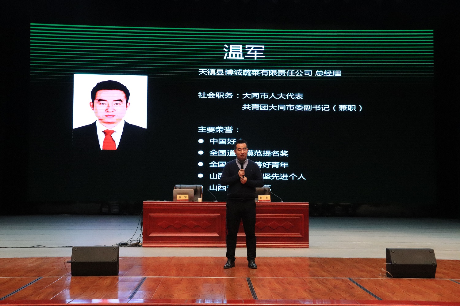 温军是大同市人大代表兼共青团大同市委副书记,曾获得“全国道德模范提名奖”、“全国向上向善好青年”、“中国好人”、“山西省劳动模范”、“山西省脱贫攻坚先进个人”、“山西省青年拔尖人才”、“山西省青年岗位能手”等荣誉。他从武汉大学本科毕业后也曾在外工作并取得了不错的成绩,但还是毅然放弃一切选择创业。温军为同学们分享了自己的创业经历,同时,就“为什么经验丰富的同事却失败了,零经验的我们却可以成功”等问题与同学们进行互动问答,带动了现场同学们的热情。温军从百年党史出发,结合党的坚定信仰和优良作风,为同学们讲解了:一个成功的创业者,必须要不计一时得失,有利他精神和良好的自控力。