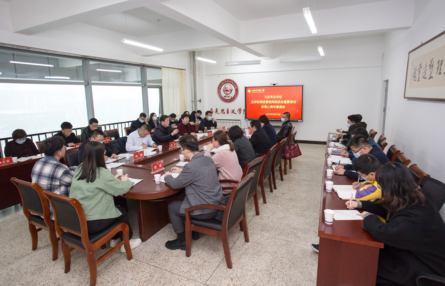 弓永华充分肯定了马克思主义学院近年来的工作成绩,并就进一步贯彻落实好习近平总书记重要讲话精神、理直气壮开好思政课提出要求。他指出,思政课要把“真理”“道理”“事理”讲明、讲透、讲清,做到“以理服人”;思政课教学要有底气、接地气和聚人气,做到“气场雄壮”,用习近平新时代中国特色社会主义思想铸魂育人。