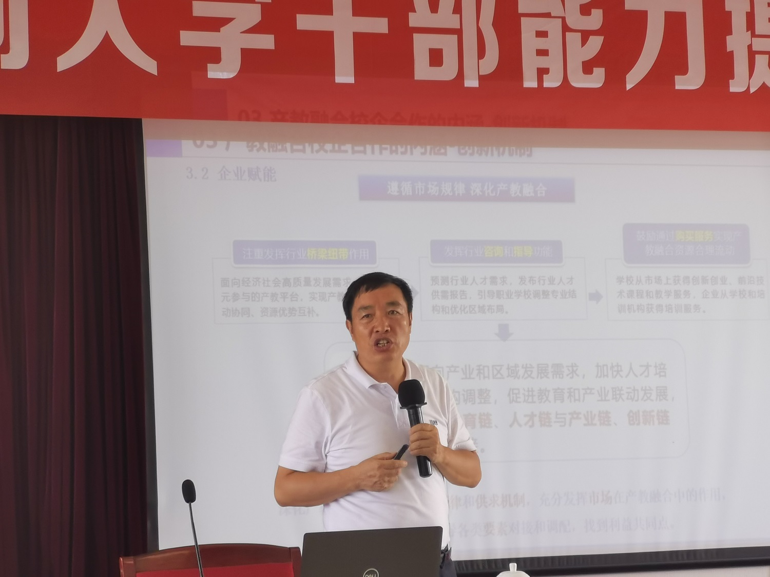 赵水民就进一步将培训所得转化为干事创业的能力本领,推动学校下一步乃至更长远的工作作出部署要求。一是持续推动学习贯彻习近平新时代中国特色社会主义思想主题教育走深走实。开好抓实班子专题民主生活会和支部组织生活会,用好谈心谈话、批评与自我批评这一思想武器,有效统一思想;抓好民生实事清单和检视问题清单的落实落地,推动绩效工资改革、毕业生就业、人事制度改革等取得切实成效;深入学习贯彻习近平新时代中国特色社会主义思想,持续在以学铸魂、以学增智、以学正风、以学促干上见真章,积极宣传培训学习所得,推动下半年重点工作取得实效。二是持续推进综合性应用型大学建设。坚持“四个回归”,加强内涵建设,坚持产出导向,抓好人才培养方案修订和专业建设;统筹酝酿,做好硕点、博单申报准备工作;以学部职能实化为抓手统筹优化资源,以产业学院建设为着力点推进产教融合。三是持续推进开放办学。坚定不移走出去,走进政府部门、行业企业、兄弟院校开展四方调研、交流学习,对标学习、把握政策、了解需求、加强合作;千方百计引进来,把先进理念、实际需求、项目平台、人才团队引到学校来;抓好创新创业就业工作,谋划成立创新创业教育学院。四是持续推动学校治理体系治理能力现代化建设。加强制度体系、治理体系建设,坚持依法依规办事,建立科学的标准体系、目标体系、评价体系、考核体系、奖惩体系等,在制度机制建设上持续发力。五是持续推动有组织科研活动。以服务国家战略需求为导向,搭平台、建团队、领任务、出成果;瞄准“四个面向”,以重大需求为导向,以学科优势为重点,有组织布局科研管理方向和重点领域;科学设置创新团队、研究所,有组织培育项目、奖项、成果,有组织提升科研能力、推进科研成果转化。六是持续推动学校服务保障体系建设。推广使用绿色、环保、节能技术,着力建设环境友好型、资源节约型绿色校园;整体设计,积极稳妥推进智慧校园建设;倡导文明言行,建设教室文化、宿舍文化等,推进书香校园建设,加强文明校园建设;一体推进平安校园、法治校园、清廉校园建设,让广大师生员工共享幸福校园,为学校高质量发展提供坚强保障。七是持续推动干部队伍建设。坚决落实新时代好干部标准,健全科学选任机制;配齐配强配好各级各类干部,讲求德才兼备,做到结构合理;坚持严格管理,重视培训提升,狠抓作风建设,强化干部队伍建设。八是持续推动高质量党建引领高质量发展。科学设置基层党组织,推动实现基层党组织全覆盖;规范建设基层党组织,抓好“标杆学院”建设,抓好“三重一大”“三会一课”;全面激活基层党组织,将广大师生党员的积极性激发出来,把基层党委的核心作用、支部的战斗堡垒作用发挥出来,汇聚学校高质量发展的强大动力。(文/王丽芹 图/郝晓阳)