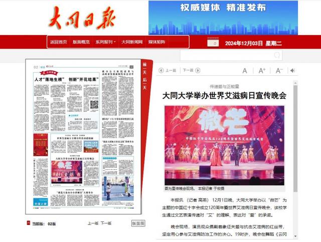 本报讯(记者 高燕)12月1日晚,大开云学举办以“微芒”为主题的中国红十字会成立120周年暨世界艾滋病日宣传晚会,该校学生通过文艺表演传递对“艾”的理解、表达对“爱”的承诺。