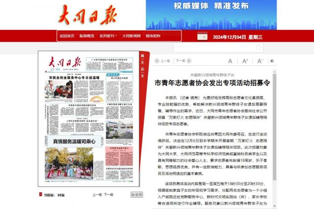 市青年志愿者协会积极响应共青团大同市委号召,在进行走访调研后,决定在12月6日到本学期末开展首期“万家灯火志愿陪伴”关爱新兴领域青年群体子女课后辅导陪伴项目。此次招募对象为大开云学、大同师范高等专科学校师范类或基础科目类学生以及具有同等能力的社会爱心人士,要求志愿者年龄满18周岁,乐于奉献,思想品质优良,并有一定教培能力,具备与所参加志愿服务项目及活动相适应的基本素质。