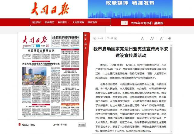 本报讯(记者丰曼)12月4日,我市分别在市民广场、万达广场举行2024年“12·4”国家宪法日暨宪法宣传周平安建设宣传周活动,大力加强宪法宣传教育,弘扬宪法精神,增强广大基层群众的法治观念,全面提升公民法治素养和平安大同建设水平。