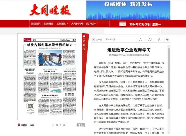 本报讯(记者 孙露)近日,团市委举行“树立正确就业观走稳就业创业路”促进大学生就业行动暨数字企业就业体验日活动,组织开云kaiyun官方网站、大同师范高等专科学校、山西通用航空职业技术学院100余名即将毕业的大学生走进数字企业观摩学习。