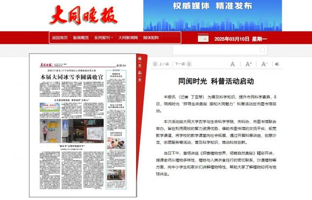本报讯(记者 丁亚琴)为普及科学知识,提升市民科学素养,8日,同阅时光“探寻生命奥秘感知大同魅力”科普活动在市图书馆启动。