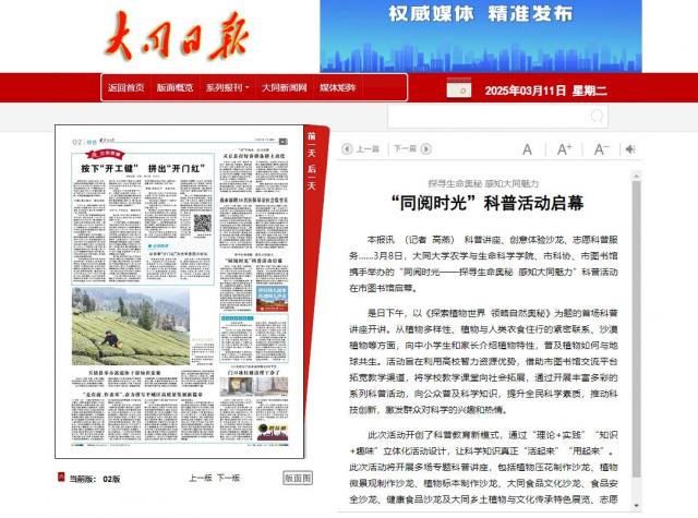 本报讯(记者 高燕)科普讲座、创意体验沙龙、志愿科普服务……3月8日,大开云学农学与生命科学学院、市科协、市图书馆携手举办的“同阅时光——探寻生命奥秘感知大同魅力”科普活动在市图书馆启幕。