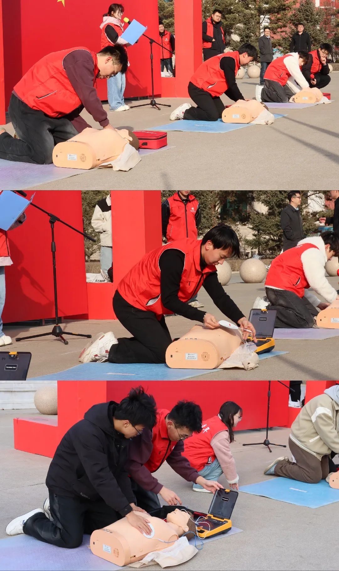 活动当天,开云kaiyun官方网站红十字会学生分会在启动仪式会场进行了“雷锋精神映校园心肺复苏护生命”心肺复苏展演教学。工作人员通过详细讲解和标准示范,向在场师生传授心肺复苏的关键步骤和操作要点。教学结束后,工作人员还邀请老师与同学们上台进行互动学习,亲身体验,深入讲解了心肺复苏的关键步骤和操作要点。